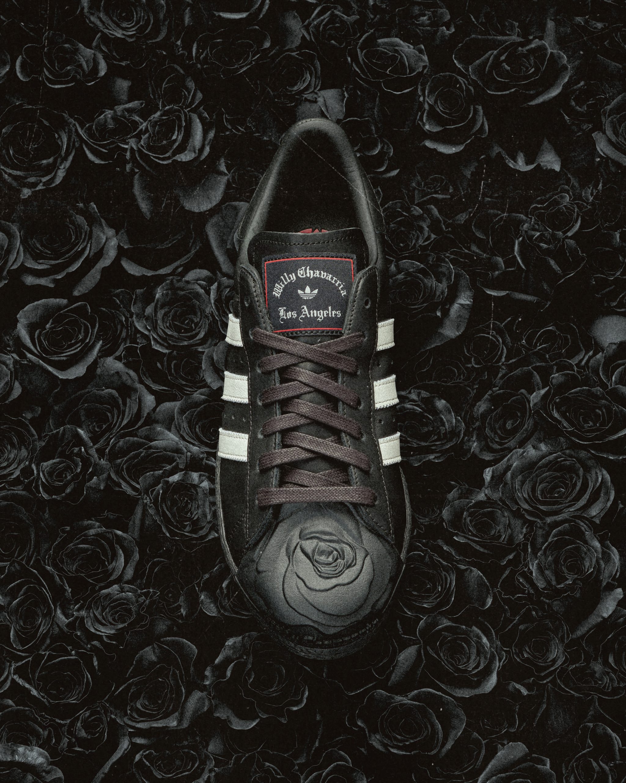 Tenis adidas Originals x Willy Chavarria Superstar en color negro y blanco con puntera en forma de rosa, presentados sobre fondos florales.