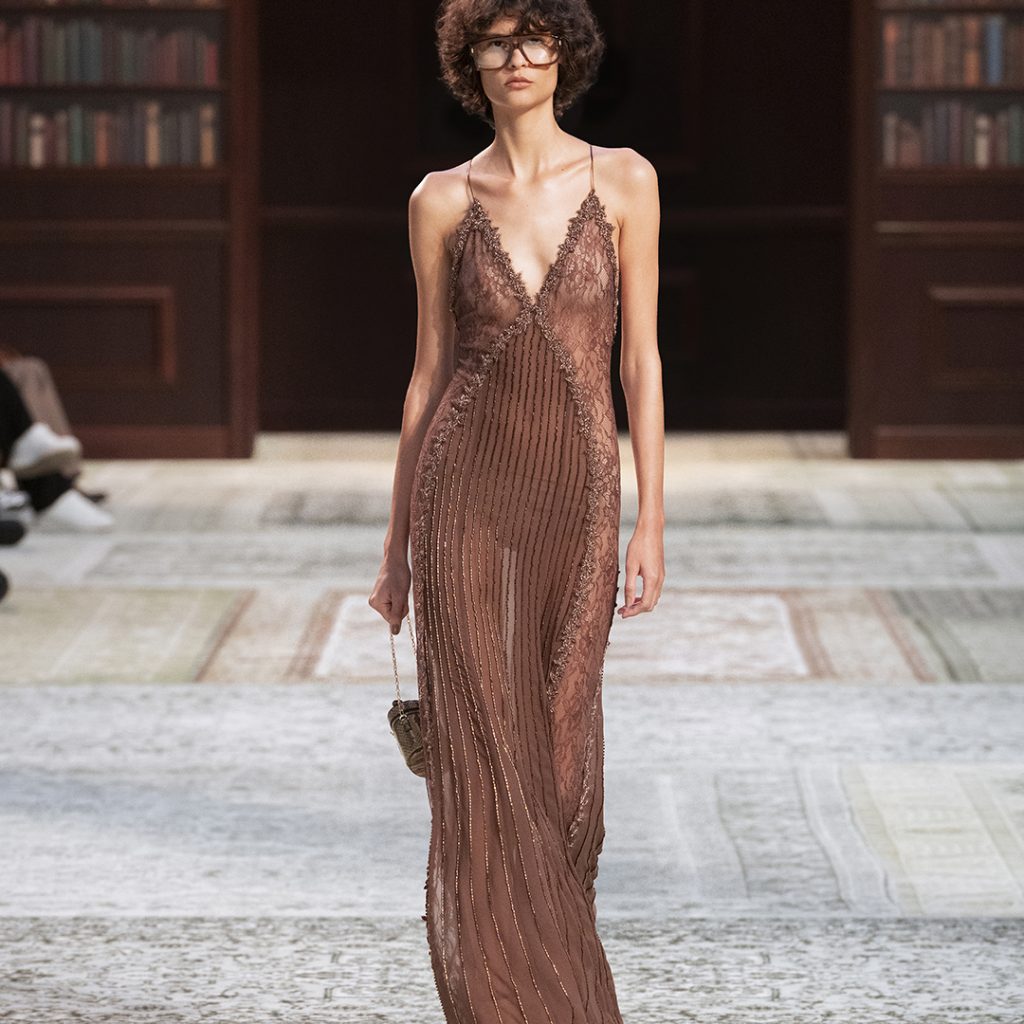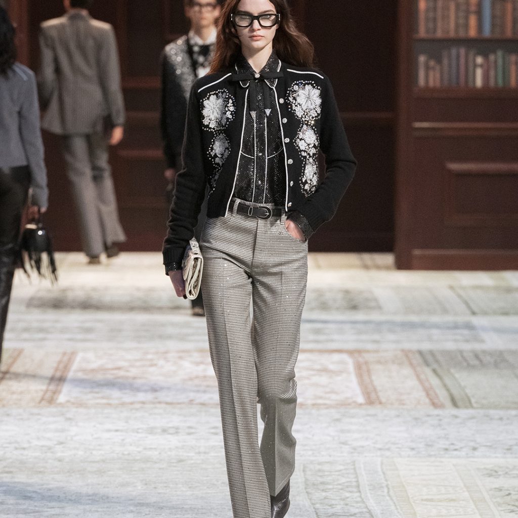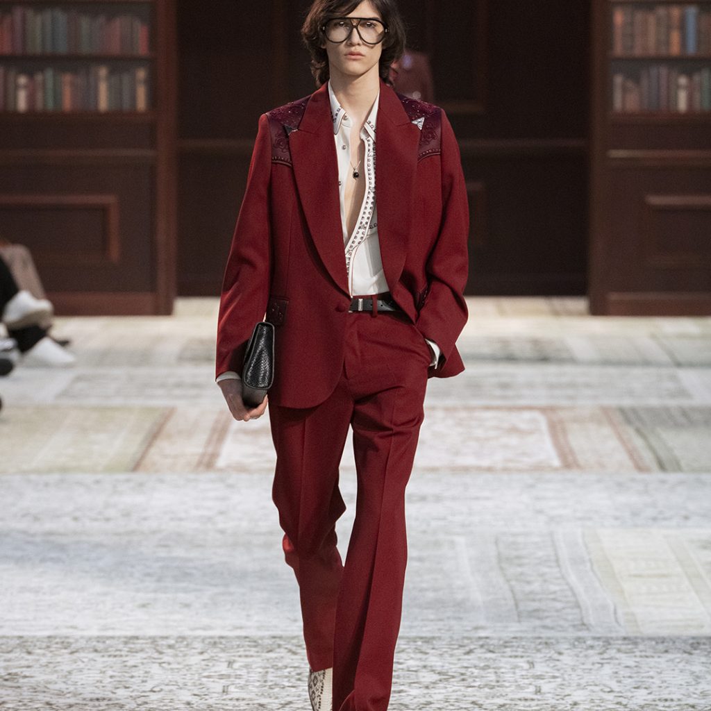 El tailoring masculino se suaviza sin perder presencia: blazers combinados con denim, botas en lugar de zapatos formales, trajes que cruzan armarios. Jeans tratados con terciopelo, bordados precisos y tejidos delicados aportan textura y carácter. No es una relajación de la formalidad, sino una manera de llevar el sentido de ocasión a lo cotidiano.