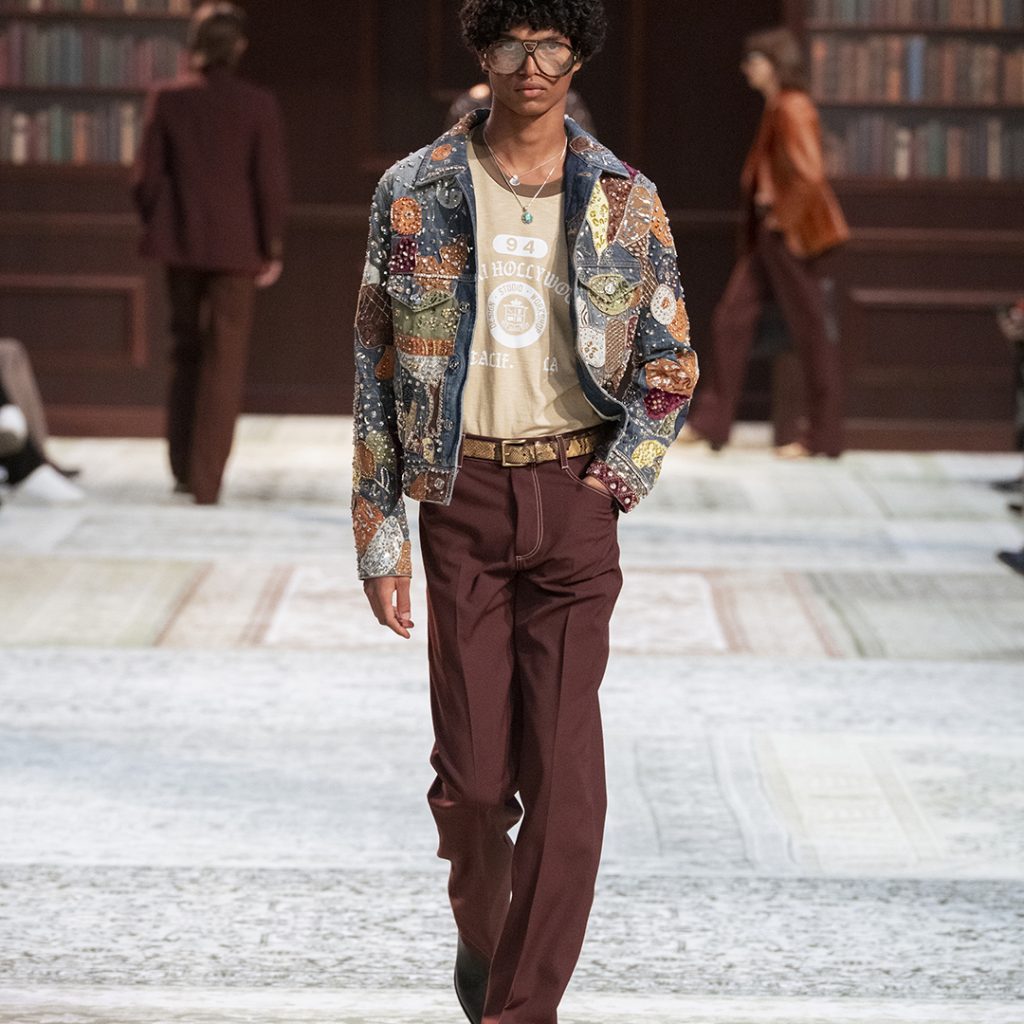 El espacio del desfile replica la intimidad de un hogar habitado: un Laurel Canyon imaginado donde cada objeto parece vivido y querido. Más que una puesta en escena, AMIRI presenta una imagen honesta de su universo actual: entre escenario y realidad, entre artesanía, música y vida cotidiana.
