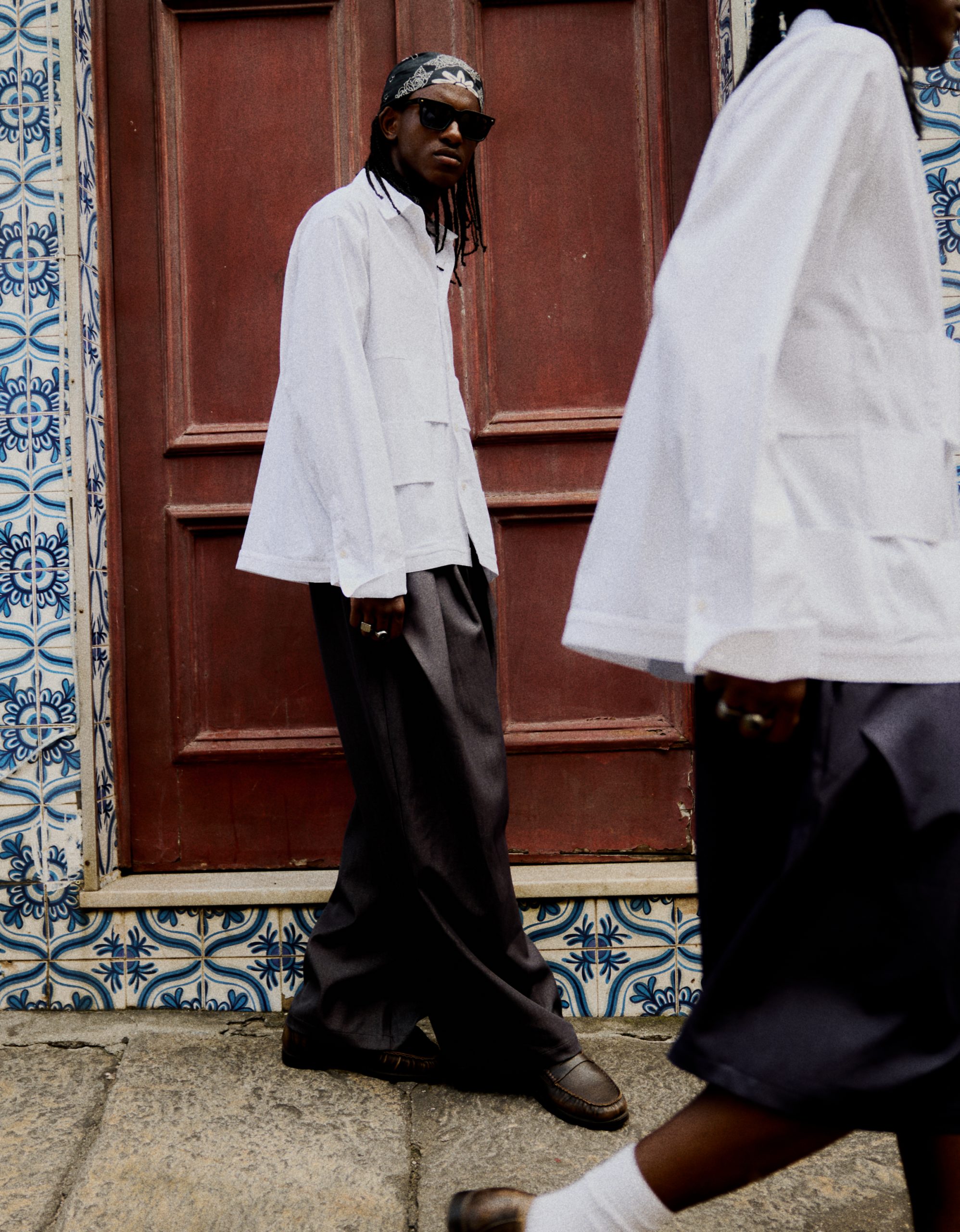 El resultado es una propuesta sin rigidez, donde las proporciones amplificadas permiten una nueva lectura del menswear cotidiano.