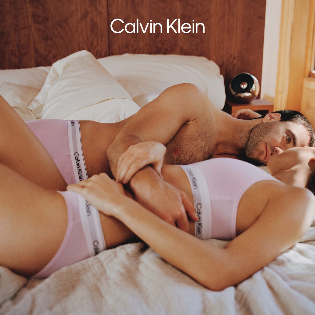 Pareja recostada en una cama vistiendo ropa interior Calvin Klein en tonos pastel, retratada en un momento íntimo y natural dentro de la campaña “Our Calvins”.