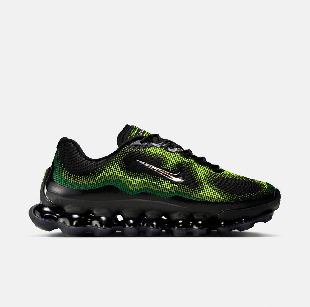 El colorway de lanzamiento refuerza la narrativa natural y experimental del modelo. Tonos verdes intensos dominan la silueta, acompañados de un Swoosh cromado, acabados brillantes sin costuras y una suela translúcida teñida.