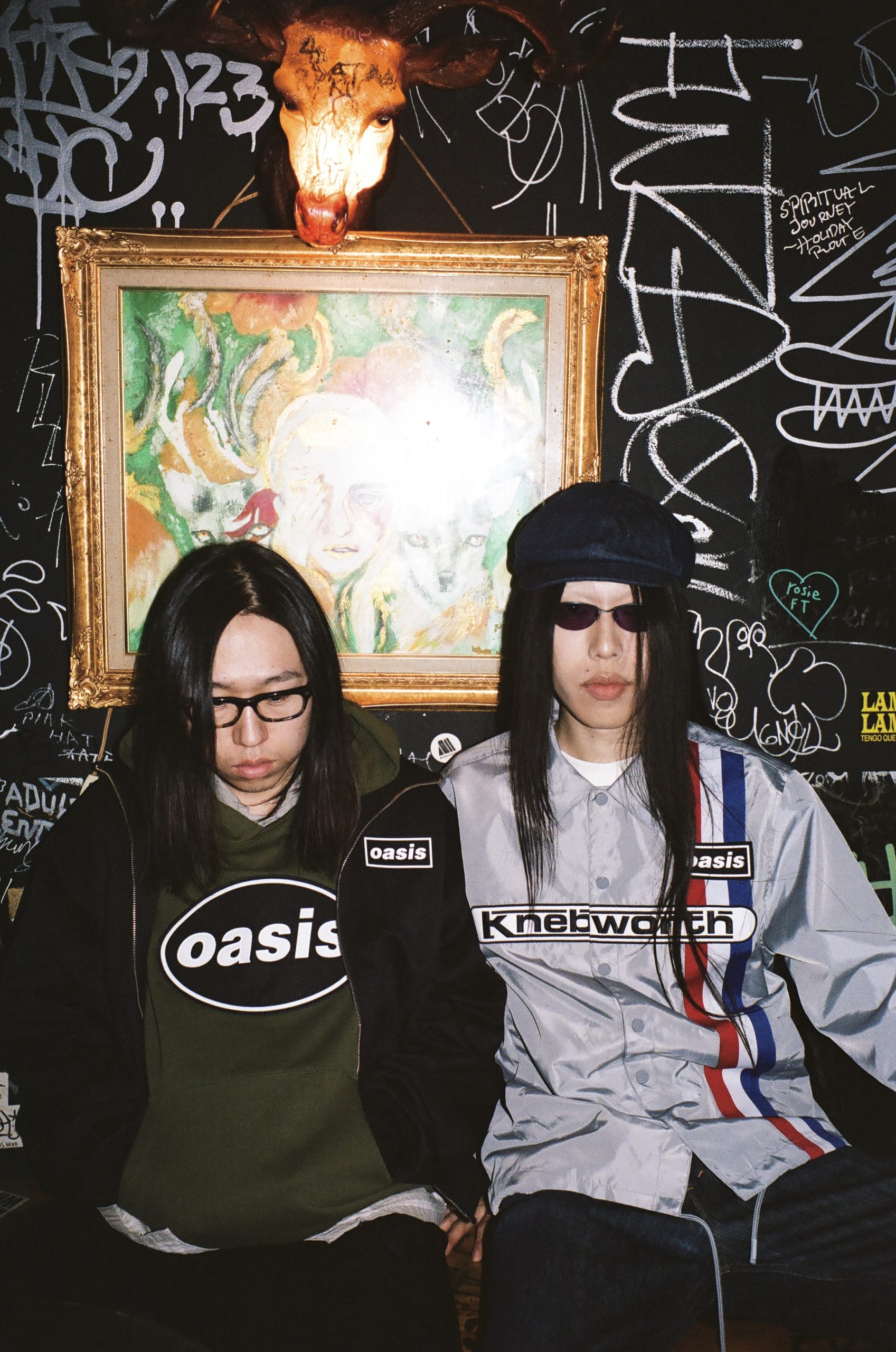 Modelos en Tokio vistiendo piezas de la colección PLEASURES x Oasis durante el lookbook, con estética noventera y referencias al Britpop.