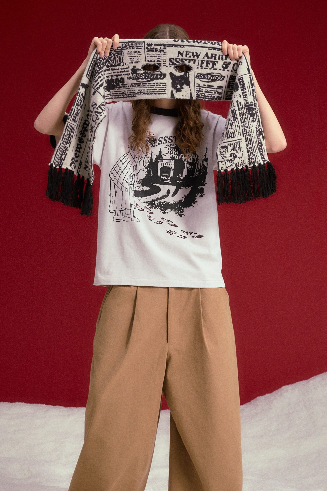 Modelo vistiendo conjunto beige de SSSTUFFF Fall-Winter 2026, parte de la colección inmersiva “The Case of Château SSSTUFFF”, inspirada en un murder mystery interactivo.