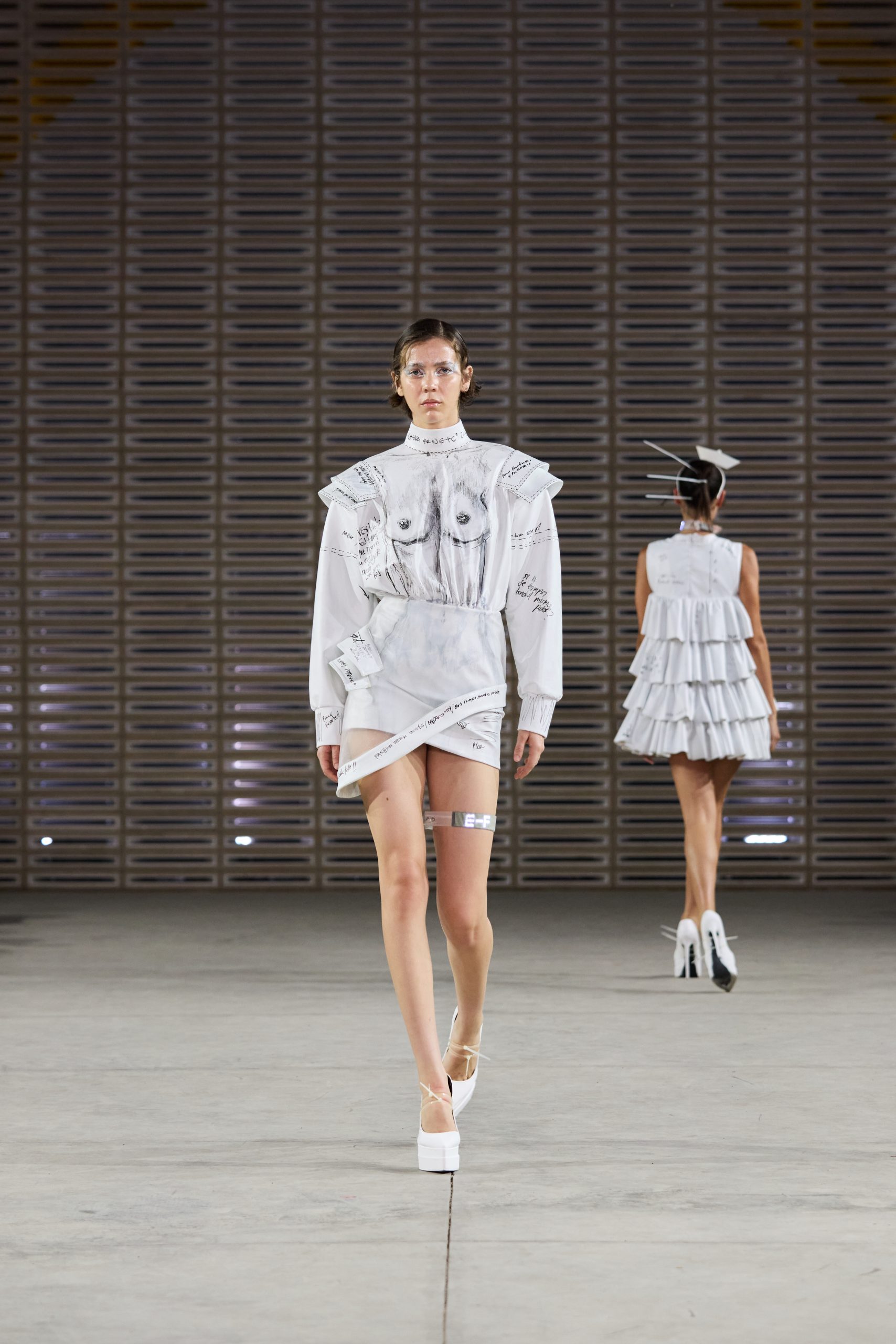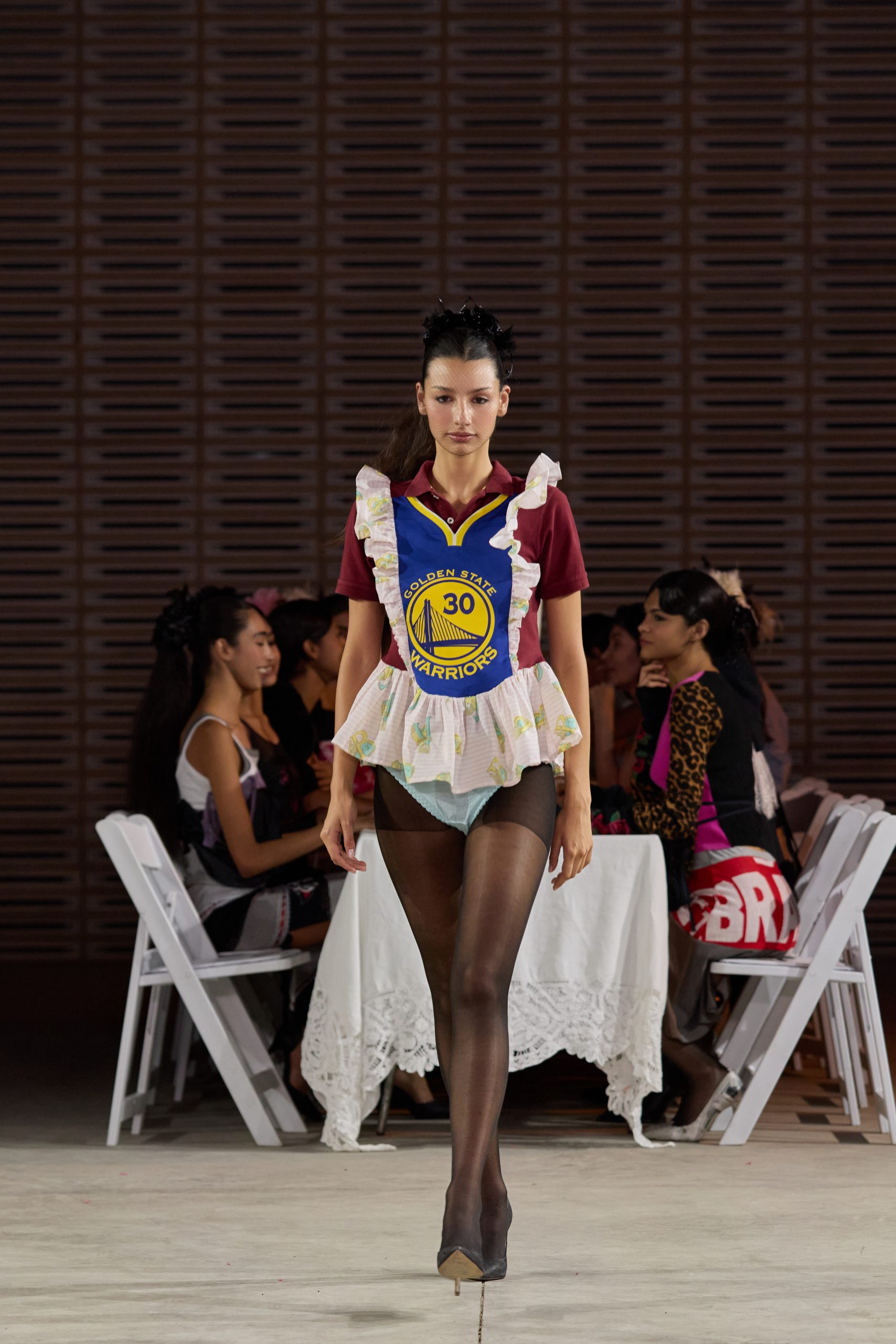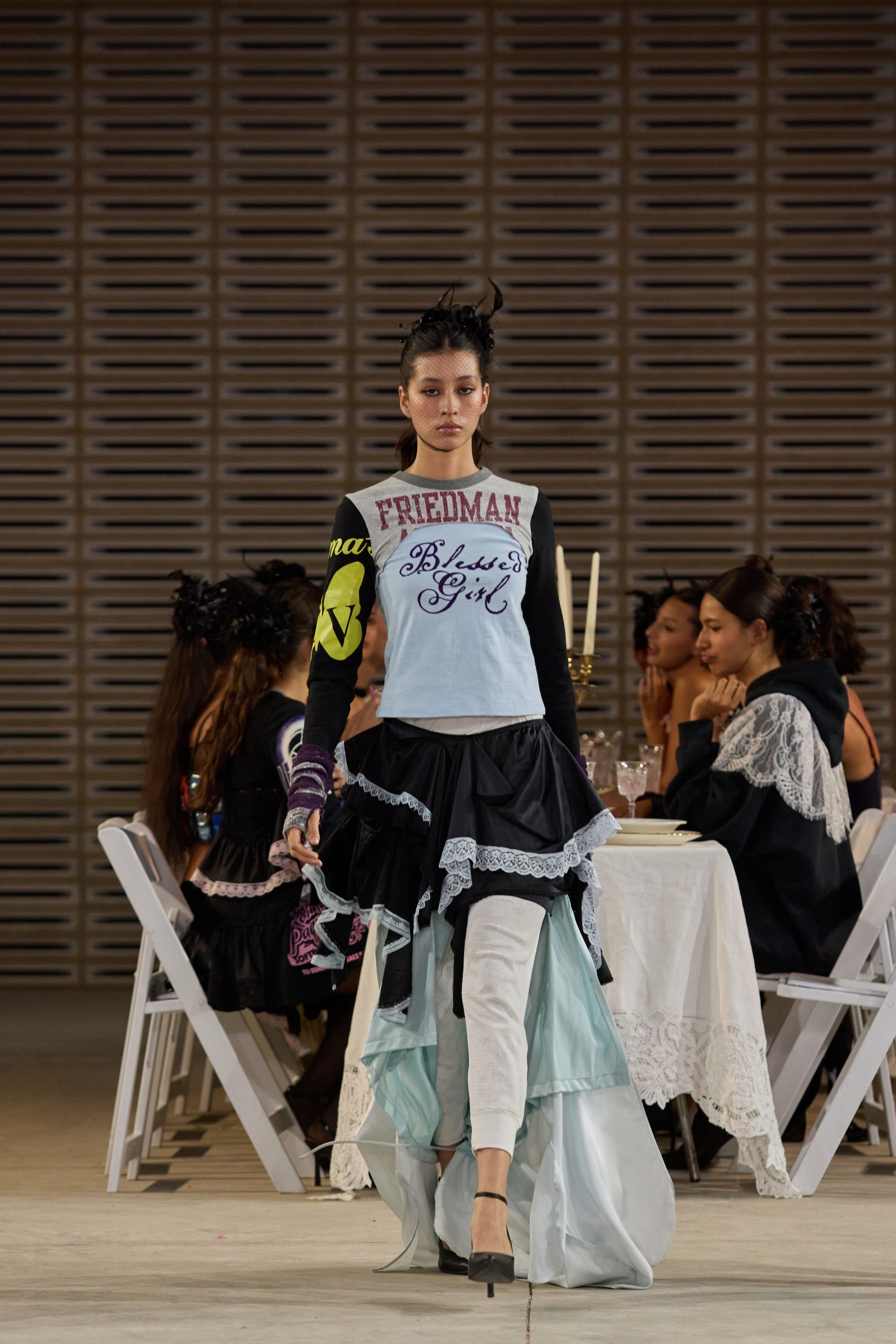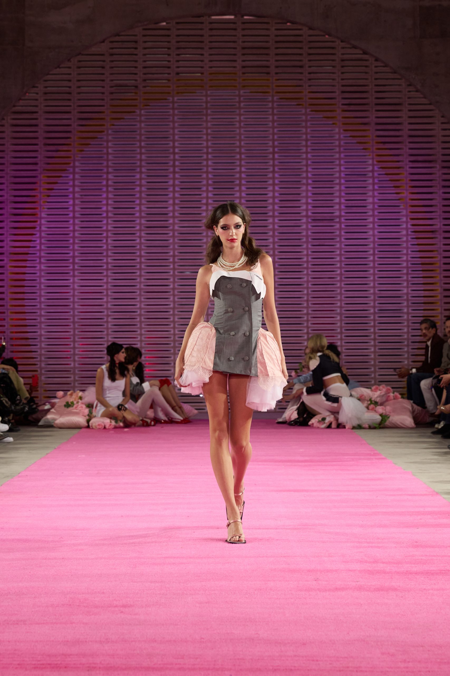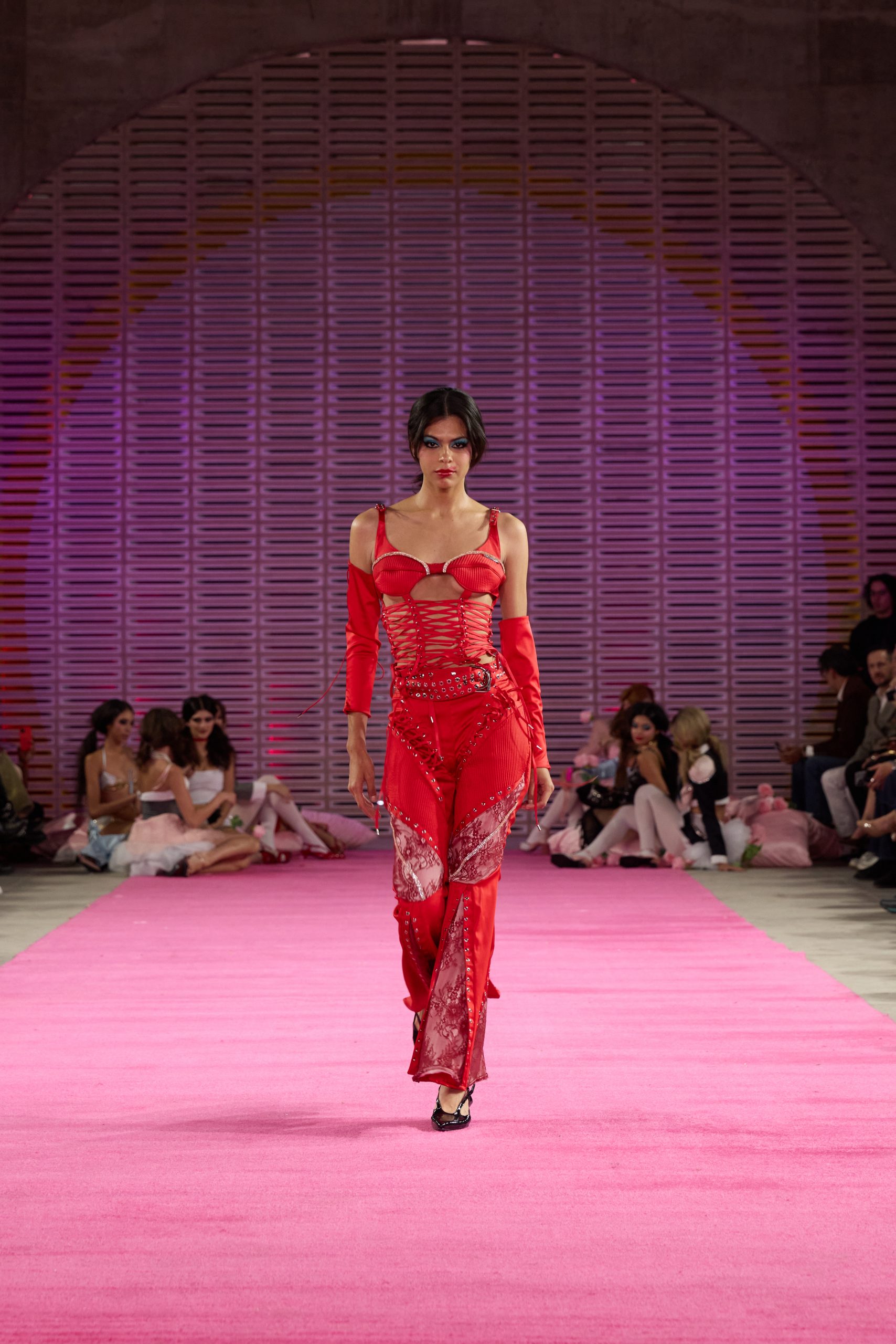 El desfile se transforma en una experiencia casi cinematográfica: una pijamada surrealista donde distintos arquetipos femeninos —la romántica, la rebelde, la pop star— cobran vida. Más que una colección, es un relato sobre crecer, imaginar y convertirse.